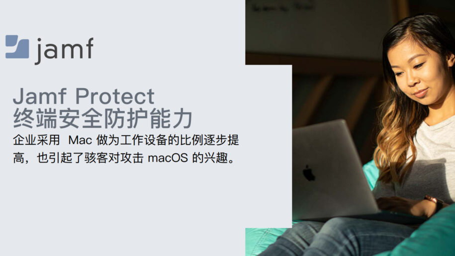 Jamf Protect 是一个专为 Mac 量身订做的终 端安全解决方案,持续保障 Mac 设备在公司合 规下,聚焦于 macOS 上的恶意程序与威胁, 掌握应用程序情报,在最不影响使用者的情况 下,侦测并修复针对 Mac 的威胁,维持 Mac 一贯的使用者体验。若同时整合了 Jamf Pro 或 Jamf Connect,Jamf Protect 就能展现出 更强大的自动化、调查研究与修复能力,处理 Mac 设备上大大小小的安全风险。